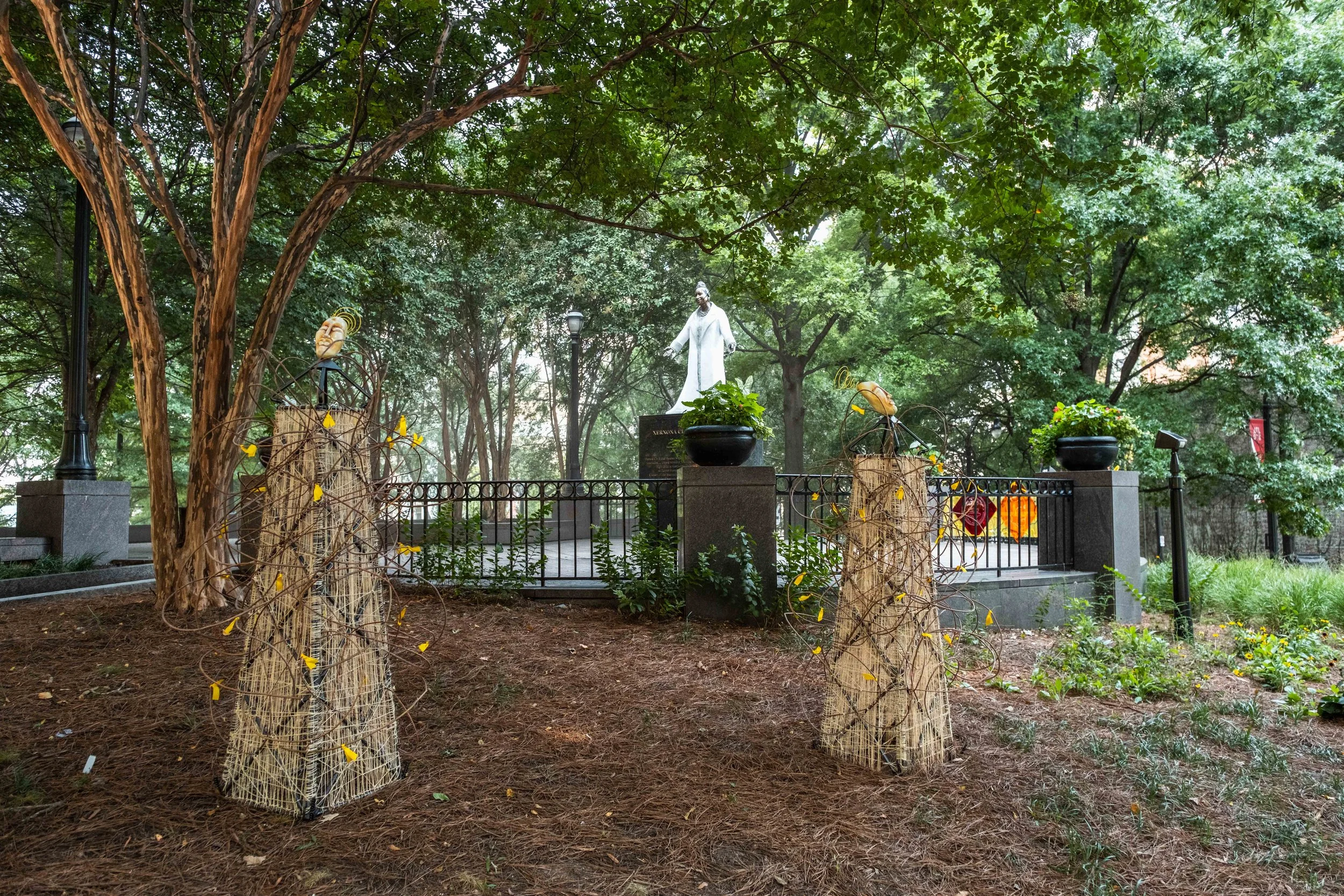 The installation highlights Xernona Clayton's tremendous accolades. There are organic floral motifs woven in with rope and themes of her accomplishments carved into acrylic, depicting a storyline as the piece cascades above an arch, creating a canopy and another installation alongside her statue. The two works compliment one another as they depict her life in vivid colors along the park.